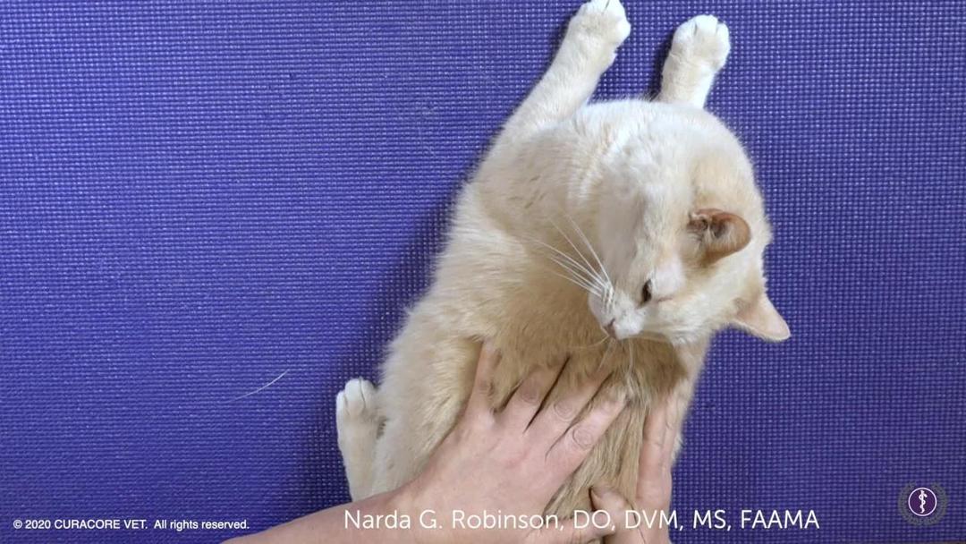 Demonstration of a myofascial palpation evaluation of a cat. This examination should be nonpainful, non fear-inducing, calm, and slow. It should provide insights into the signs indicative of the location and nature of somatic pain the cat may be experiencing.