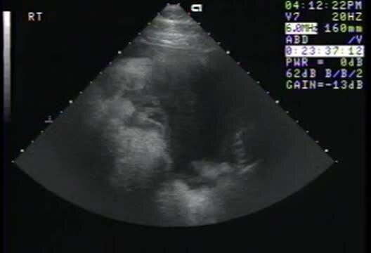 Thoracic ultrasonographic examination of a 2-year-old Thoroughbred with pleuropneumonia, demonstrating pleural effusion, pulmonary atelectasis, and fibrin accumulation on the visceral pleura.