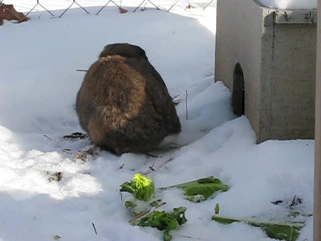 Rabbits enjoying time outside in the snow. Rabbits are significantly more tolerant of cold than of heat.