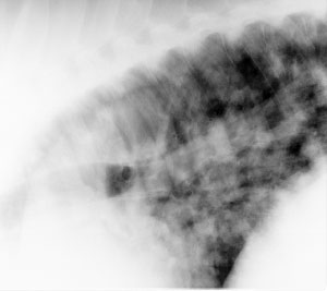 A radiograph (lateral view) of the caudal thorax is shown. Which of the following is a correct description of the radiologic findings?