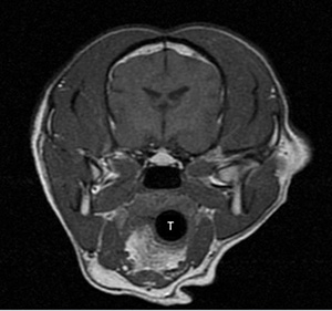 MRI: The cervical mass is located in the area of the thyroid glands, which could not be visualized. Mass is in close association with the jugular vein and internal carotid artery without evidence of invasion. The mass in the left horizontal ear canal was noted. No intracranial mass was detected.