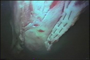 Intra-abdominal view of ovarian pedicle of the tumor that has been stapled for hemostasis before removal through the paralumbar incision.