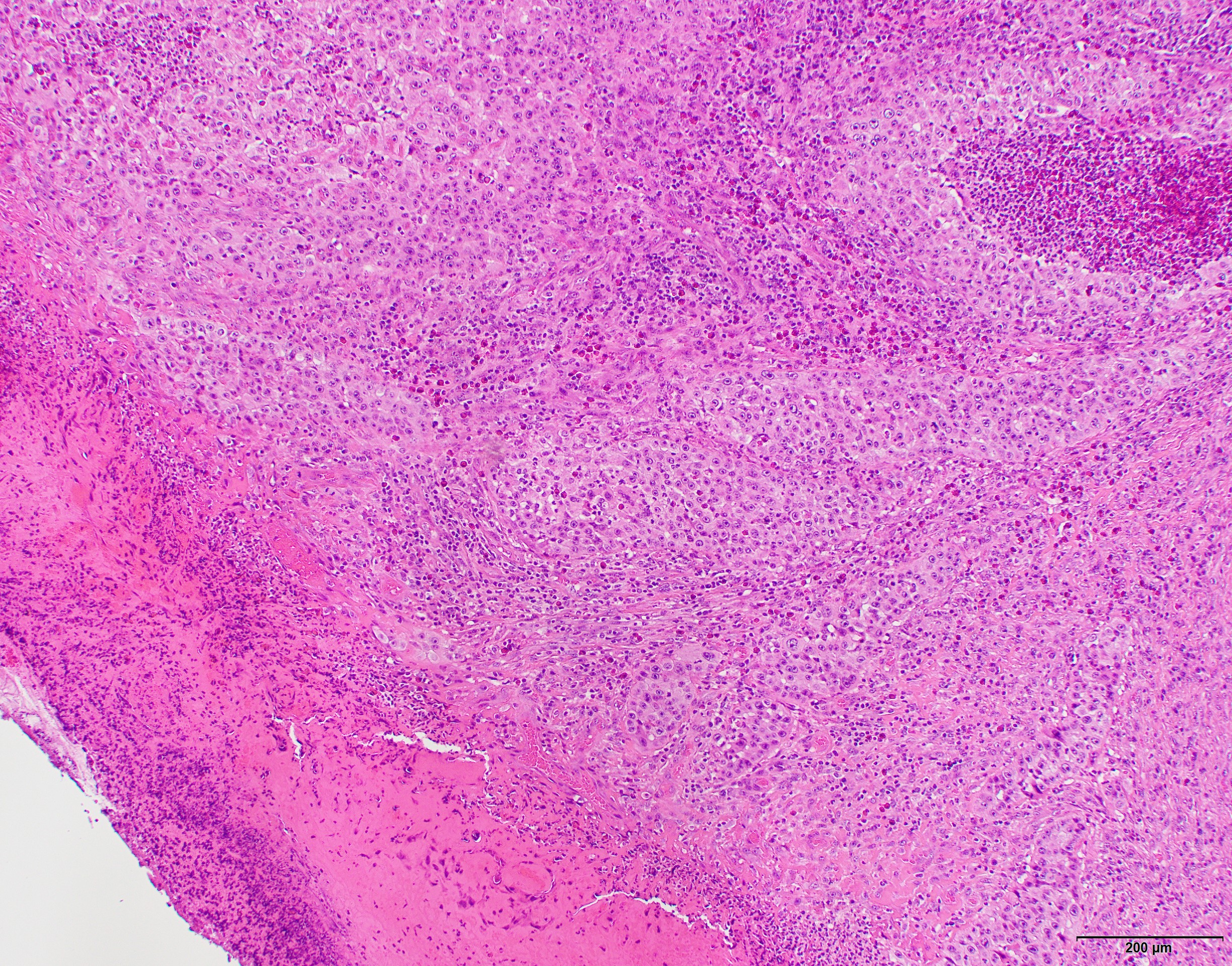 Histopathology of the eye mass: Pleomorphic population of variably shaped cells consistent with advanced squamous cell carcinoma, with surface ulceration and inflammation throughout the lesion.