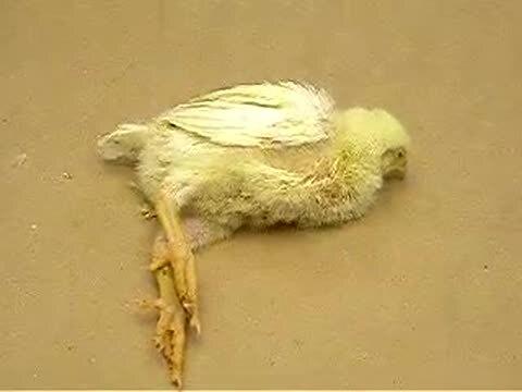 Clinical signs in a chick affected with encephalomyelitis. Note the fine intermittent tremors of the head and legs.
