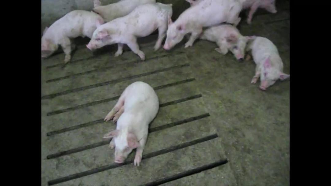 Piglets naturally infected with Teschovirus A. Clinical signs such as paresis, paralysis and ataxia are commonly observed in affected pigs. Note the normal mentation and awareness of surroundings within affected animals. Clinical signs may vary from mild (ataxia) to markedly severe (paralysis and opisthotonos).