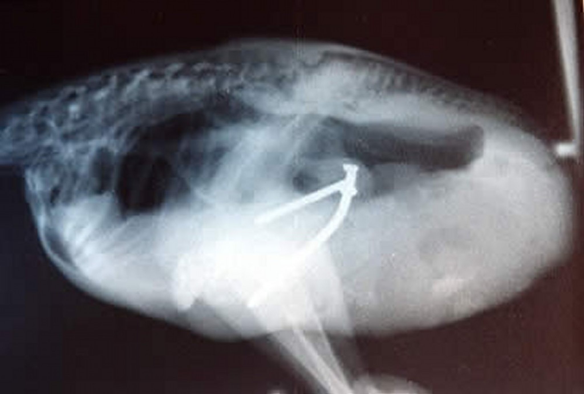 Radiograph (lateral projection) revealing metallic foreign bodies in a 6-week-old ostrich chick.
