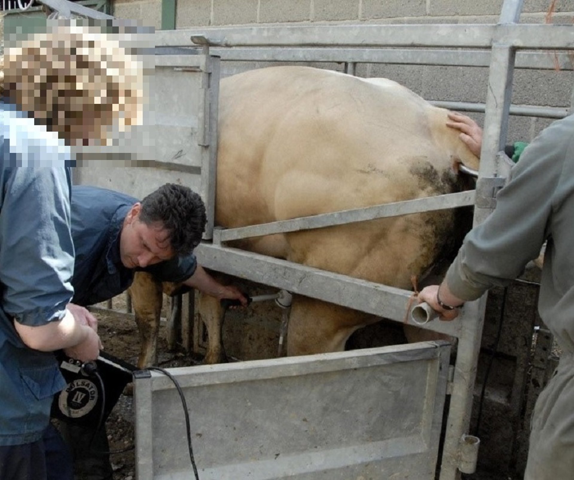 The electroejaculation technique is being used here for semen collection to examine the breeding soundness of a bull.